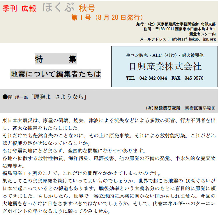 季刊ほくぶ 秋号(第1号) 2011年8月に第1号を発行いたしました。PDFでダウンロードできるようにしましたので、是非ご覧くださいませ。 ダウンロードはこちら